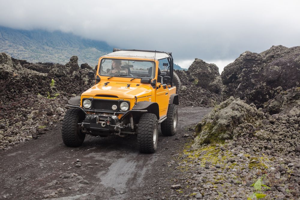 - A curly-haired man is looking away driving an offroad yelow vehicle at the top of a valley with dark ground road: £29
