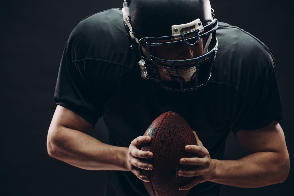 American football player with black helmet and armour running in motion holding ball getting ready to score a goal close up shot over dark background