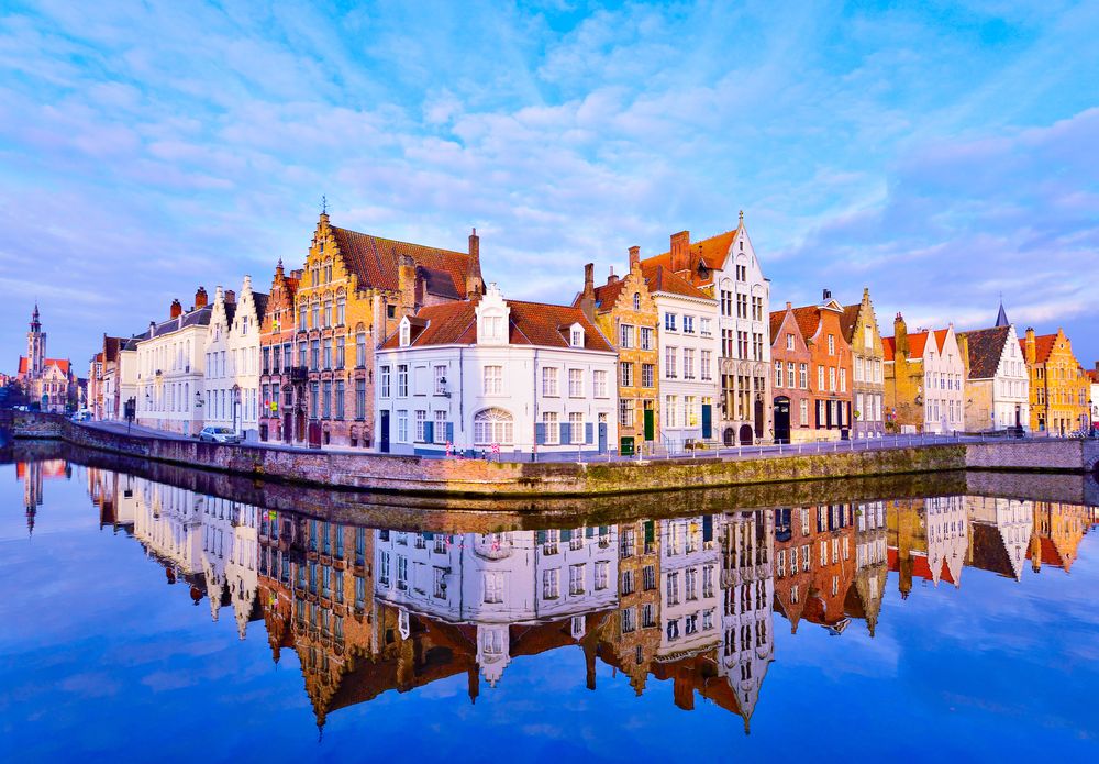 Cityscape view of Bruges and traditional houses reflected in water at sunrise in Belgium