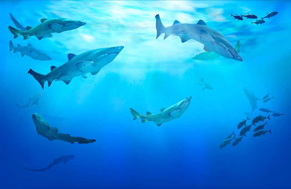 Life in tropical waters Hunting sharks Shoal of fish