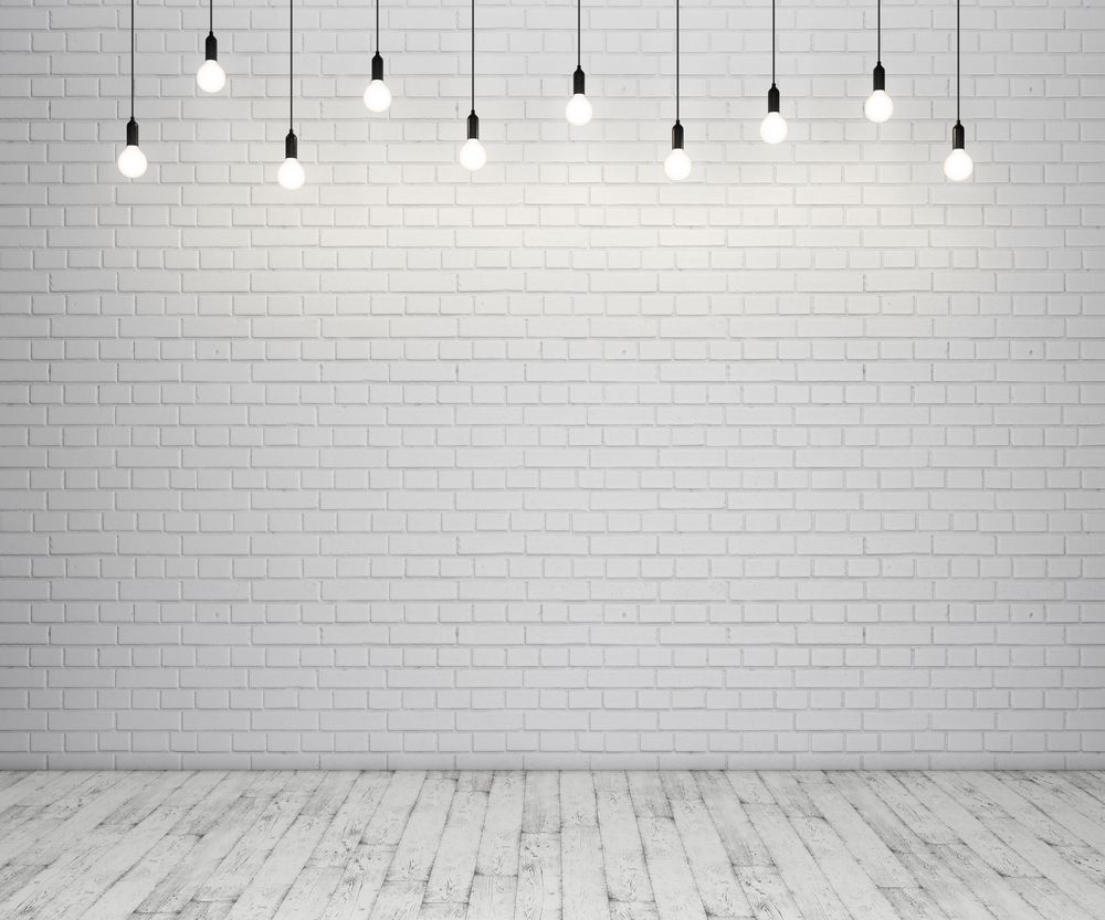 - Painted brick wall and wooden floor with glowing light bulbs 3D rendering: £29