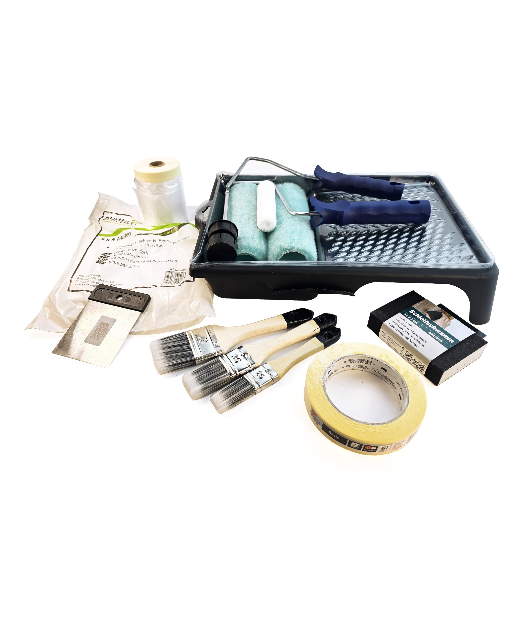 \n* Element Clip Standard 28cm 10cm \n* Mini Roller Felt 10cm \n* 3M Scotch Masking Tape 3-days 24mm x 50m \n* Maxi Roller Green 18cm \n* Sanding Sponge medium/fine \n* Japanese Spatula 75mm \n* Cover Quick Protective Film with Tape 55cm x 33m \n* Maxi Roller Set Green 18cm \n* Tray Insert 18cm single piece \n* Basic Paint Brush Set 3-pack (25, 35, 50 mm) \n* Woodworking Spatula 200 ml \n