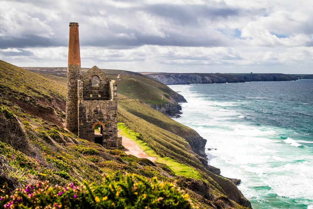 Ruins of Cornish tin mine on coast in Cornwall UK
