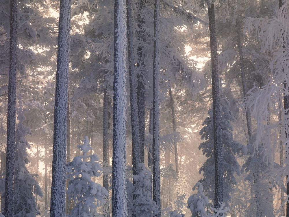Sunbeams Through a Frosty Coniferous Forest