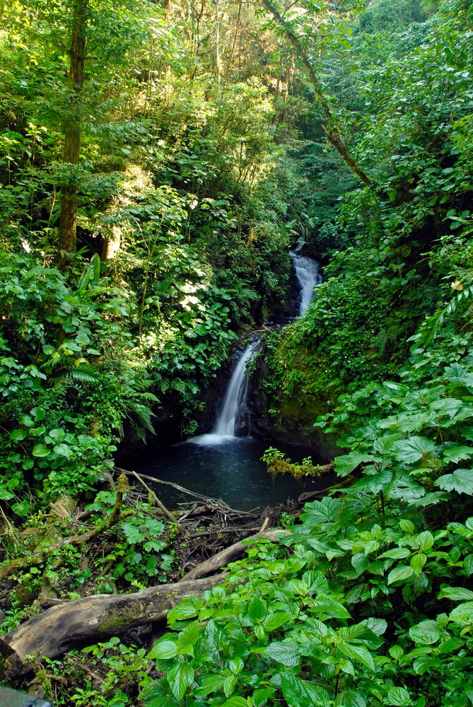 Waterfall in lush tropical rainforest in Costa Rica where many plants grow that have uses in the pharmaceutical industry
