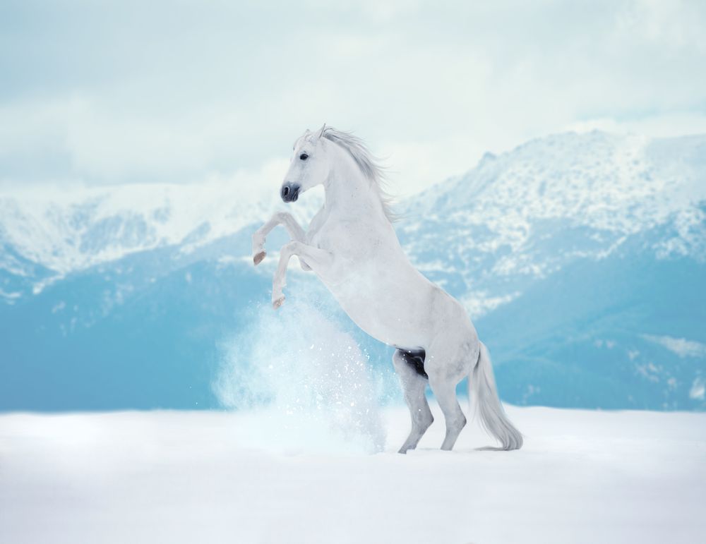 - White reared horse on snow on mountains background: £29